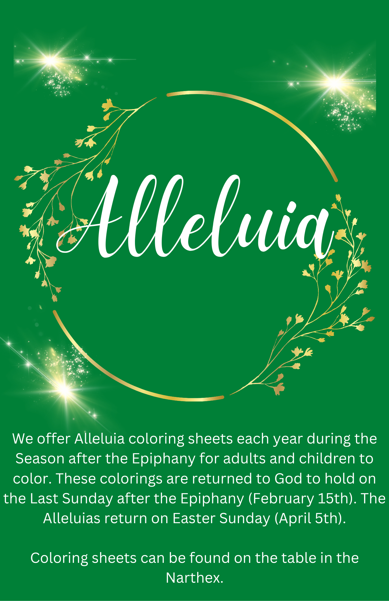 Lent is a season in the church year—a time of about 40 days (not counting Sundays) leading up to Easter. It begins on Ash Wednesday and ends on Holy Saturday, the night before Easter Sunday. Lent is a time when Episcopalians and many other Christians focus on spiritual growth, reflection, and preparation for the celebration of Easter, when we remember Jesus’ resurrection.